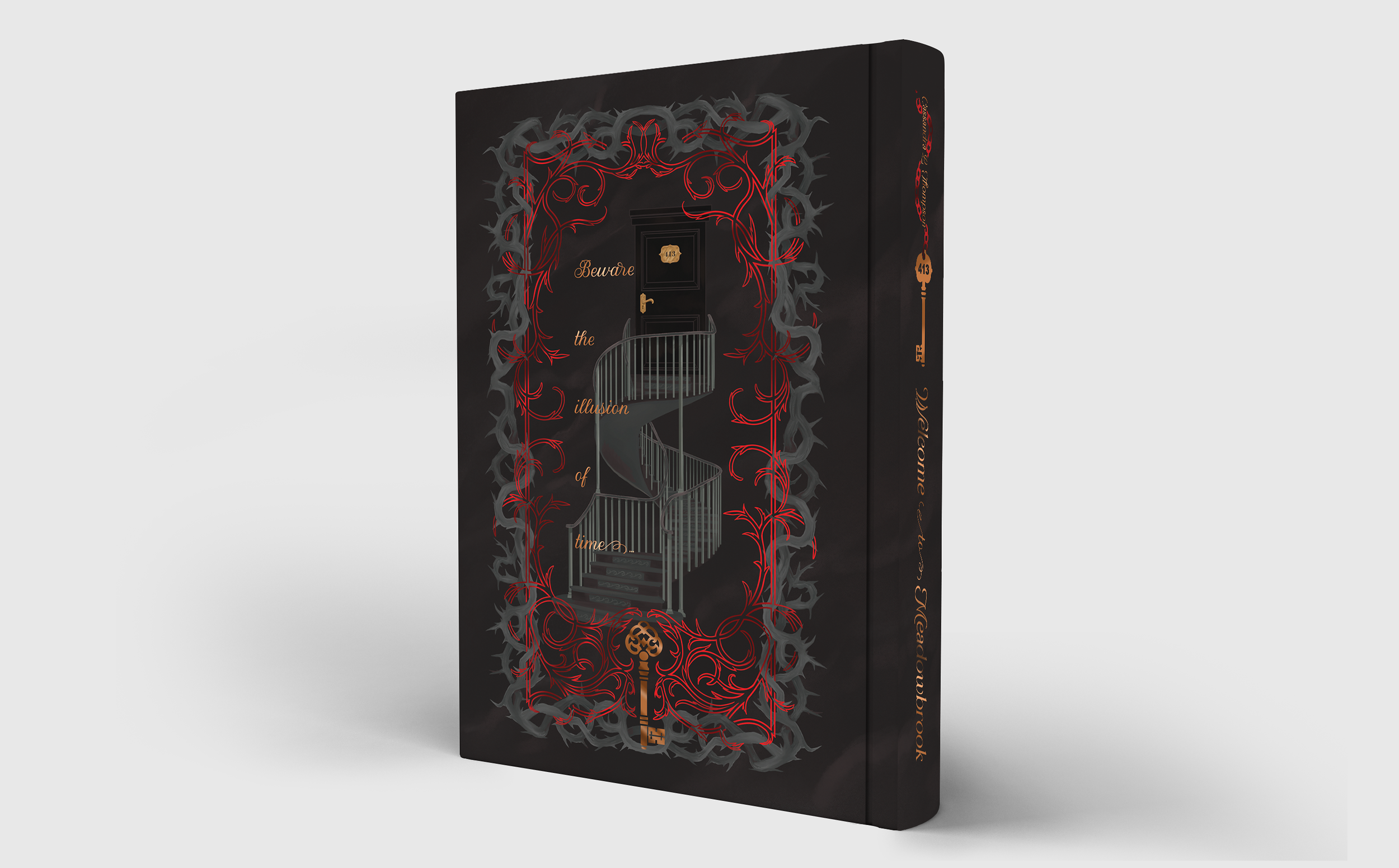 “Welcome to Meadowbrook” by Cassandra L. Thompson, hardcase illustration design featuring red and copper foil and spot gloss, for Twisted Retreat (2025).